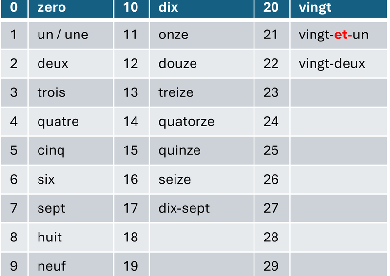 Tellen is in het Engels, Duits en Frans verschillend en dus verwarrend. Het Duitse tellen is hetzelfde als in het Nederlands, maar Frans en Engels wijken daar van af. De Fransen en de Engelsen tellen vanaf twintig verder met 'twintig-een', 'twintig-twee' enzovoorts. Het frans begint hier bij zeventien al mee. Tot slot heeft het Frans nog wat eigenaardigheden: